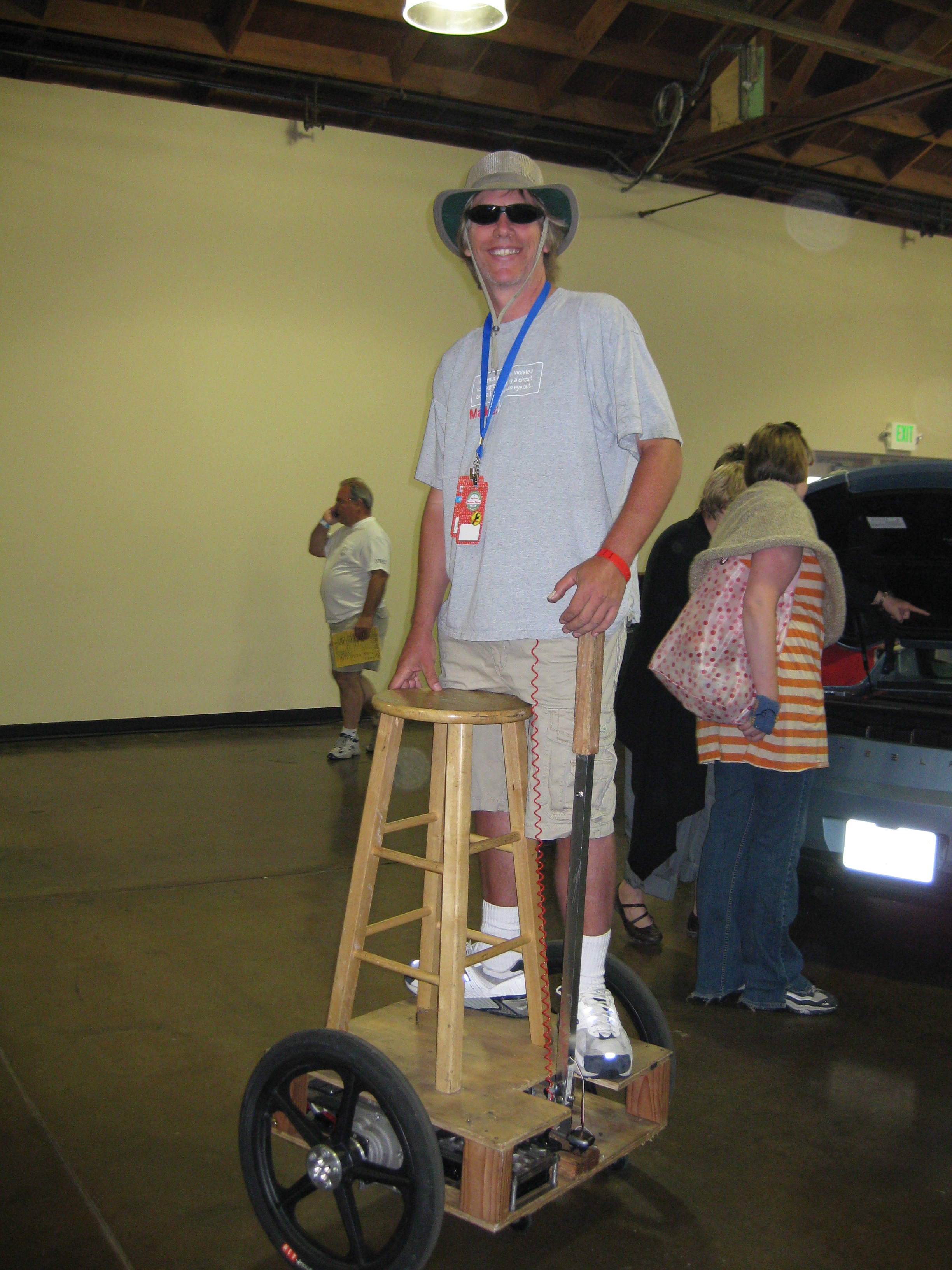 At the 2008 Maker Faire, the scooter was a great hit with the crowds since it was totally home made compared to the fancy versions. Little kids and parents drove it quite a lot.