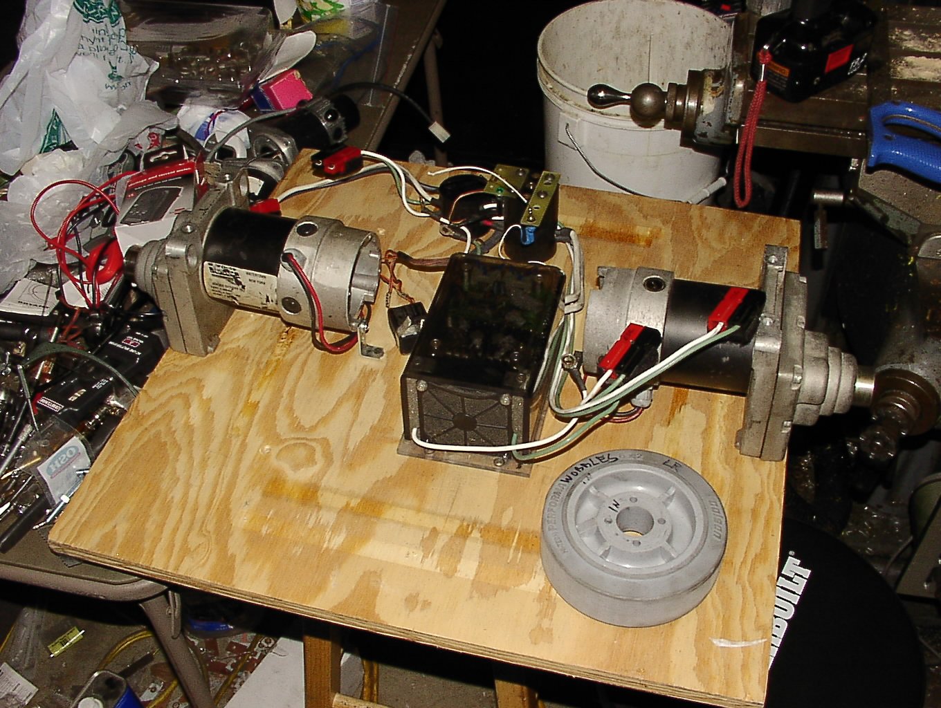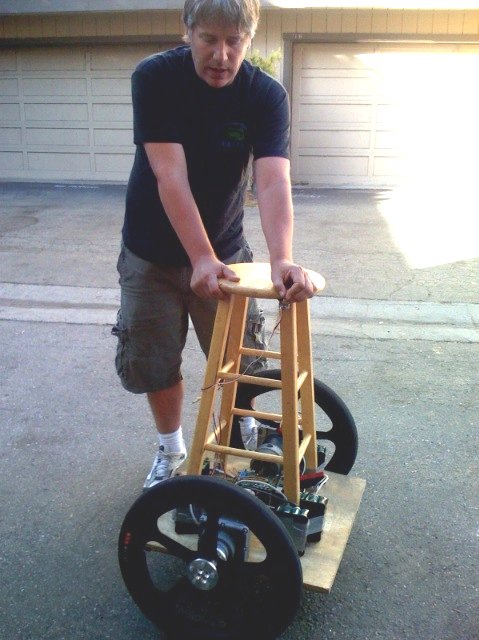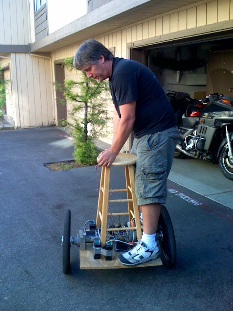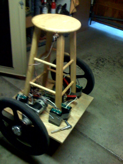 This page is to keep track of the development of a self balancing two wheel scooter. Here is the link to the RFL forum where this project originated. The lastest updates are at the top of this page. 2007-2009 - Here are test drive videos of the scooter. 06/07/09 - I was over at Peter's today and we worked hard on making 3 recumbent bike frames from EMT tubing. I brought them home to notch the ends on the mill. Then we can weld them together. Here is the site with all of the plans that we followed. 06/03/09 - Finally some pics of our camping chair variation of the scooter at Maker Faire! The scooter hit 15.6mph today! lounger1.jpg, lounger2.jpg, barstool3.jpg, lounger4.jpg lounger5.jpg, barstool5.jpg, lounger6.jpg, barstool7.jpg, loungervideo1.jpg, lounger8.jpg lounger9.jpg barstool10.jpg barstool11.jpg06/02/09 - The Maker Faire was great!! Saturday the scooter had the lounge chair on it and was a joy to drive around. So much more comfy. My lower back got sore, but with a rolled up jacket for lumbar support is was solved. The crowds reaction to a lay down self balancing scooter was incredible! I was asked questions all day and evening long. Toward the end of the day the joystick control was getting very twitchy left and right. As I recall, the increase from 22v to 30-32v accounted for most of the twitchyness. Sure feels like EMI. When I arrived Saturday morning one of the tires on the scooter had actually split it's inner tube. Not sure why. Glad I had a thornproof spare. So Sunday morning I felt it was a better idea to put the barstool and tiller steering back on. That way I could also give many rides.