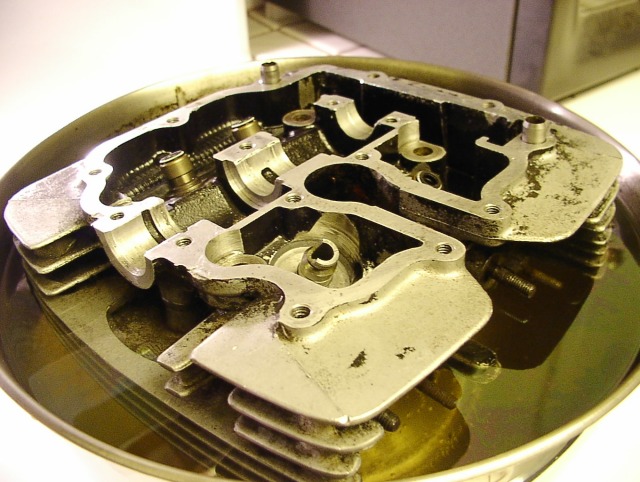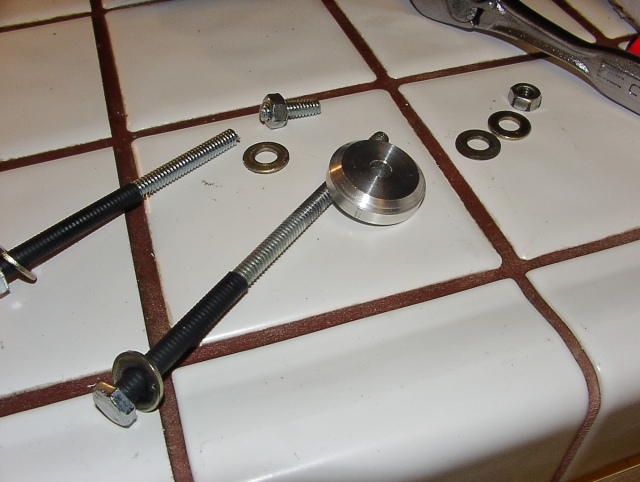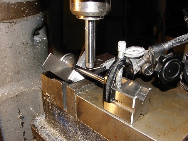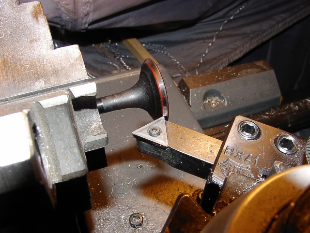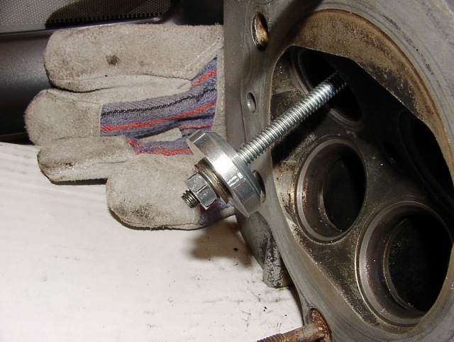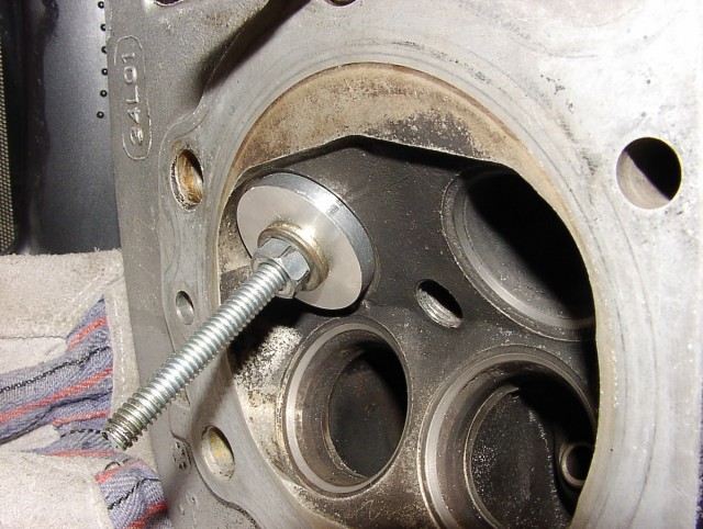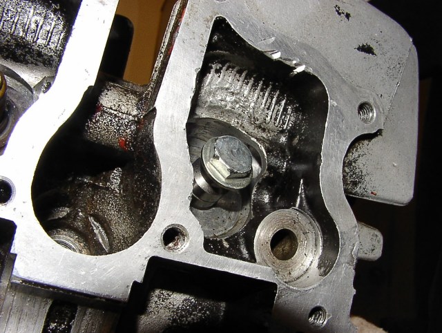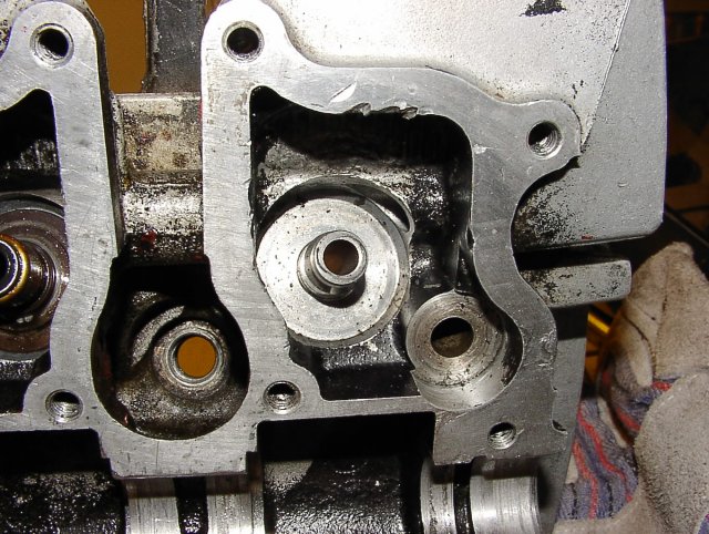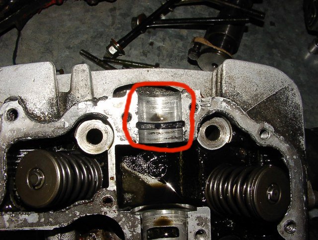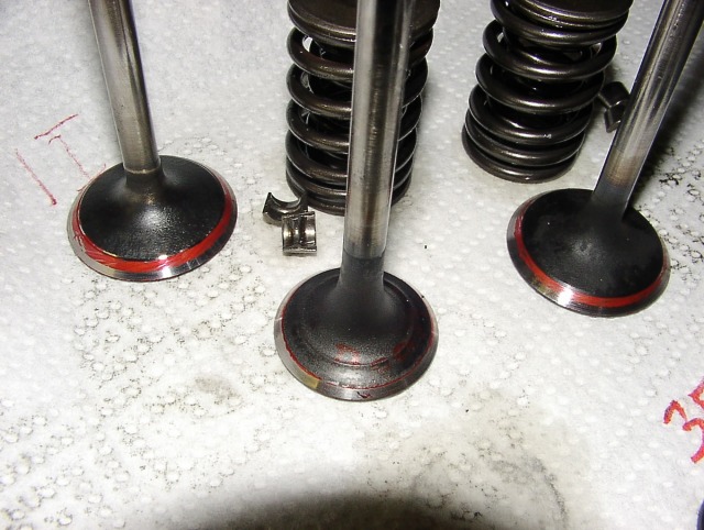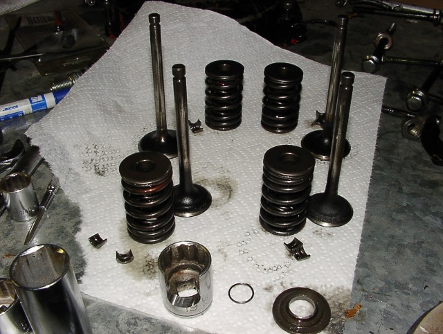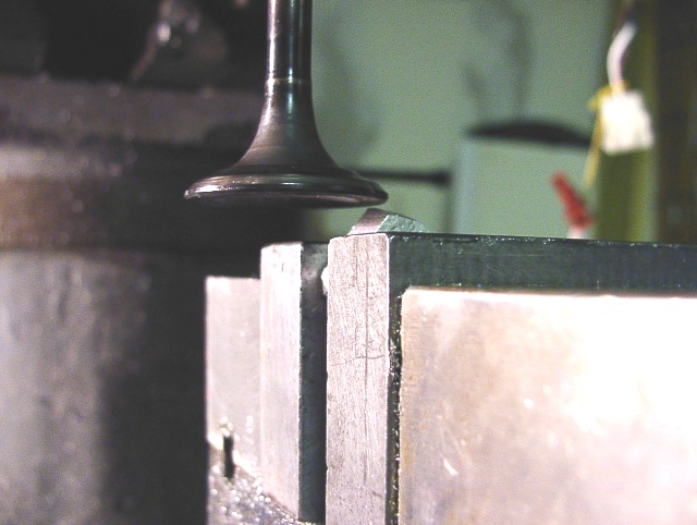 seems to sit a bit high on the teeth. I wonder if this is normal? 07/18/04 - The 2nd order of valve guides arrived. Ordered 2 just in case one gets messed up again. Fortunately the first valve guide installed just fine this time. The guide was put into the freezer to help reduce it's outside diameter. Instead of pounding in the guide this time, I made a fixture to pull the guide through using a 4.5" and 5.0" long 1/4-20 bolts. Heat shrink tubing was added to the bolts threads to protect the guide's inside diameter from damage. The other aluminum part was turned on the lathe to fit the valve seat exactly. The way it ended up working was to tighten the nut, then tap the head of the bolt with the ratchet. You can see I dinged the aluminum gasket surface with the ratchet. Turns out a hammer worked better. The hammer would allow a 90 degree rotation of the nut before getting too tight. Then the head had to be tapped again. Trying for more than 90 degrees resulted in a snapped off bolt. This tap and turn method took longer but was much more gentle on the valve guide. I only had to debur the very top of the guide to allow the valve to pass through after it was installed. The guide stopped going in easy, so I reheated the head and guide in the pot of boiling water again. That helped finish the install. As it turns out the valve seat in the head was still aligned with the valve's face, so I didn't have to have the seat re-cut. The guide didn't need reaming either, even though I bought a 7mm reamer just in case. 07/16/04 - The guys on the XT/TT Yahoo group convinced me to use a standard oring with lithium grease to hold it in place during assembly. It worked great. The fuel bowl does not leak any fuel at all now!! During the draining of the fuel bowl small particles of grease were observed. So I ended up draining the fuel bowl 3 times. Makes me wonder if vaseline would work better, as I think it disolves in gasoline. So the carbs are fully assembled now and ready to run. This also means I can put together a carb "renew" kit with all of the orings I've fit to the carb. I'm thinking $10 per kit. Since nobody on the planet suppies carb kits for the XT600, it's a bargain. The new valve guides should be here today or tomorrow to allow for another experiment filled weekend!! Getting the head done finishes the engine. Sometimes a new guide requires re-cutting of the valve seat in the head as well as reaming of the guide with a 7mm reamer. We'll see how lucky I get!! The front and rear fenders came in today. They are used original Yamaha XT parts. Glad to have them. 07/13/04 - I bought a 10 qt stainless bowl from Target to heat up the head to help remove the guide. So if it gets trashed there is no real loss, just $6. It barely fits the head. The water level is about 3/4" from covering it. It boiled after maybe 15 minutes or so on high. Proves that water and oil do mix if you boil it. Grabbed the head with leather gloves, ran onto the balcony and hammered out the old guide in about 4-5 hits. Lined up the new guide and started pounding it in with the drift I turned from a 6061 aluminum rod. The 7mm diameter tip of the rod that fits into the guide would bend a tad if I did not hit it perfectly. The drift handle was 1/2" diamter. It started slowly sliding into the head, but I kept bending the tip of the drift. This was the downfall. With uneven shock load to the top of the guide it finally cracked and a couple small pieces fell off. So I had to admit defeat, reboil the head and pound out the new damaged guide. I had forgotten to put the guide in the freezer as well. Sigh.... Here it is being boiled to remove the new guide. guide2, guide3. Time to order more guides. 07/05/04 - Here are the valves seated in the head. It's easy to see the marks on the valves where they hit the piston. They were bent, thus causing almost no compression. My automotive valve spring compressor was a bit large to fit the tiny valves, so I machined an old 19mm socket into a tool to help it fit the springs. I eventually figured out how to straighten the bent valve heads. By placing the valve stem in the mill, then coating the flat side of the valve with a wipe board marker. The aluminum tool in the vice acted as a high point indicator. The head of the valve will scrape the aluminum indicator, removing a bit of the marker to show where the high spot was. Then I would just move the table over to place the edge of the vice under the valve. By bringing the knee up and measuring the distance that the valve was bent back, I could keep track of how much distance the valve was being bent. A few cylces of this process turned out nicely straightened valve heads. The one valve that had a bent stem was straightened using a technique I use for straightening helicopter shafts. Next I had to try and recut the 45 degree valve faces. Using the mill made chatter marks on the face. So the lathe was set up to cut new faces at a 45 degree angle. This worked great! It left a very nice shiney face on each valve. The red die on the valve is used to see if the valve face touches evenly around the valve seat in the head. Then the seats were lapped to the valves with grinding compound. Using a cordless drill to slowly spin the valves in the head, made fast and clean work of the lapping process. So now that the valves have been saved (Yippeee!), the busted guide will get replaced when it arrives. I think the motor would run fine with the valve stem seal being gone on the broken guide, but the way the oil flow is layed out, the oil will pool around the exhaust valve and possibly cause the motor to smoke. Here is a shot of the valves after the lathe operation and after being tested to fit the valve seats. Notice that the red die is missing on the top 2/3 of the face. That's exactly where you want the seats to hit. The entire cause of the bent valves were that the timing chain somehow was not in time or came loose. It also ground away some of the sides of the case.