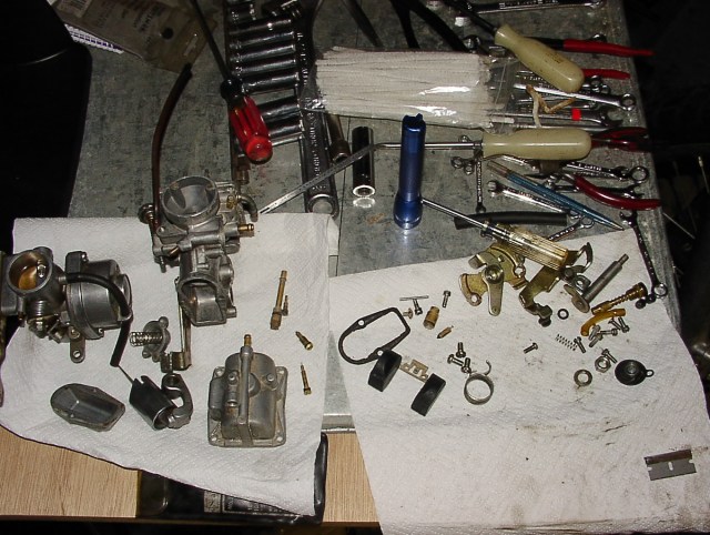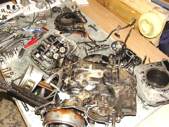 Please support the hard work and research on the XT600 webpage by donating a little. 09/14/04 - The bike has been running fine. Had a couple 5 mile rides nearby. With the new factory clutch lever and perch, the clutch disengages far better and I can find neutral more often. I also ordered and received factory mirrors, so now the bike is legal. Ordered and installed some gasket material for the tail light too. Gave rides in the driveway to Leah and Toni. A very nice feeling having a cute woman on the back! The bike's size makes it easy to take 2 people. The only major work left is the oil leak on the right side of the motor. I think that's the only location leaking, but it leaks like a seive. It will be more obvious after I replace the gasket. The oil and filter will also get changed as well. Hoping to get the missing reflectors for the front forks and the tool kit to fill in above the tail light. Looking forward to truing and balancing the tires. The rear one is so bad it shows the heavy side down while still on the bike! I think I will take off the 48 tooth rear sprocket and put on the new 42 tooth one for better overall driving. First gear is a bit too low right now. Can't wait to take the driving test so I can get M1 motorcycle endorsement on my license. Since I just had surgery, I'm not ready to terrorize the streets just yet anyway. But when I do....! 09/04/04 - While at DMV I found out I had to take the automotive test as well as the motorcycle test. What a stresser! Only missed one question on the auto test. Flunked twice on the bike test, but passed on the third try only missing one. Whew!! Now I have a motorcycle permit which does not allow riding on freeways, at night, or with a passenger. Took a few rides around the hills in this part of San Jose. Lotsa fun. This thing is still hard to start, but runs well. The new carb clamps didn't change the way it runs, but at least I know it's assembled correctly. Just made a new order for mirrors and the clutch lever assy. I prefer a restoration approach. The mirrors will make it 100% street legal. The air shocks have held their 12psi of pressure without leaking. I am happy about that. Although rebuilding the forks would be good experience. Still need to get the proper armor apparel in case I dump it. There is a large motorcycle riding park not far away south of San Jose. I can't wait to explore it. They have trails rated like ski slopes. The bike starts to vibrate a bit at around 35mph. I know the rear tire is out of balance as well as both tires being out of true. I have a spoke wrench and am looking forward to trying my hand at tire truing. I have an industrial high point balancer that will allow the tires to be balanced once they are trued. The motor has a bit of clattering as the rpm's are increased. Don't know if it's piston slap, pin slap or what. Doesn't sound like the clicking of misadjusted valves as I have been through that already. Listening too another XT600 would be very helpful. It's also about time to change the oil. I will do that when I replace the leaking right side engine case gasket. 08/20/04 - The bike sounds like it needs a valve adjusted. Carb clamps are on order. They should help with the rough running and starting. It really is hard to start. Several rubber grommets and other misc parts are on their way. The headlight comes on and then dies out. I'll have to look into that. The trans shifts very nicely but the shifter is a bit stiff. Hurts the top of my foot. Don't even need the clutch. The clutch drags a bit. The engine leaks oil a bit. So far I'm very happy with the carbs. Sometimes I forget to shut off the fuel and they don't flood the engine. Getting the title is under way. I handed everything over to Don's Lein Service. He takes everything to a DMV for professionals, and will hopefully be able to get the title and registration ready in a couple days without too much cost. In the mean time I'll go down to DMV and get the written test out of the way. I hear it's only 10 questions. After the registration is ready, I'll go take the driving test. 08/17/04 - The timing chain guides and many other parts arrived today. They were used but in great shape. So I buttoned up the rest of the motor. The magneto went on with a new woodruf key. The timing chain adjuster only went in about 6 clicks. That's less than half of what it was before. Both side covers were installed. I messed up the gasket on the right engine cover. Dripped oil like a seive. I pulled it apart and realigned it. We'll see if it still leaks tomorrow. While it was draining there was a lot of fine aluminum particles in the oil. Hopfully this was some left over from when the timing chain ground away the inside of the case. The engine would only run if it was primed with fuel directly into the carb. After a few tries and with the choke on it holds an idle ok. The carbs need clamps so they seal to the engine better. I forgot to put the vent tube onto the top of the valve cover. It spewed oil all over the motor. I sprayed carb cleaner over the engine to evaporate the oil. Eat me tree huggers! The motor with the gasket realigned seems to not leak oil now. Glad to see that there is oil pressure! The mounting bolts all need to be tightened and some odds and ends bolted on to make it complete. Tomorrow I should actually get to ride it and test the transmission. I actually bought motorcycle oil so that the clutch will work its best. 08/02/04 - Since the cam sprocket arrived today, I put in the timing chain and cam gear. The only holdup is that the motor needs good timing chain guides. They haven't been shipped yet. Sigh. Lots of misc Yamaha factory parts came in. That will help with assembly once the motor is done. I also picked up a XT350 parts bike for $150 yesterday. It didn't have a front end. None of the plastics or rear fender fit the XT600 except for the headlight cowling. Dang! They are nice too. So they all went on Ebay. At least it came with the turn si